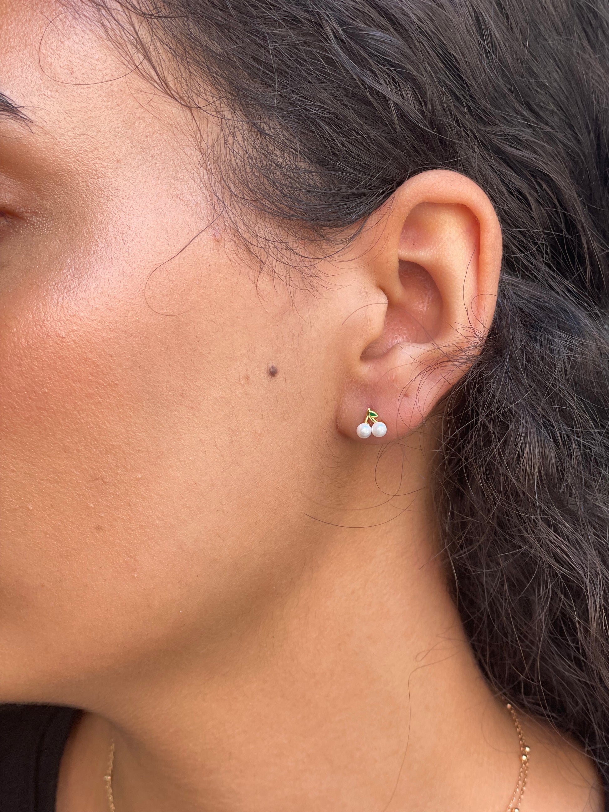 Charming cherry studs crafted from 925 sterling silver, featuring glossy pearl-like beads and a touch of green enamel. The Cerise Studs add a playful twist to a classic look — subtle, sweet, and easy to wear.