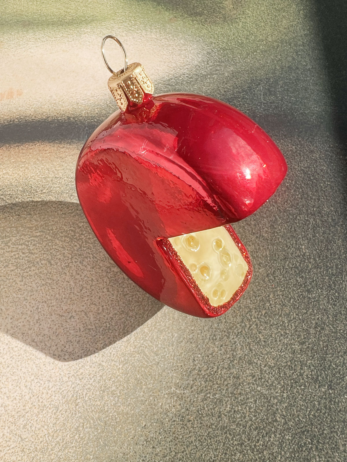 Delicious Edam cheese. Hand-blown glass ornament, hand-painted in the EU.