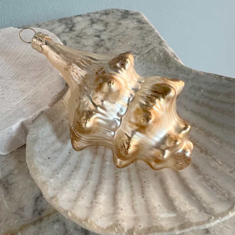 Beautiful shimmering beige conch shell ornament. Hand-blown glass ornament, hand-painted in the EU.
