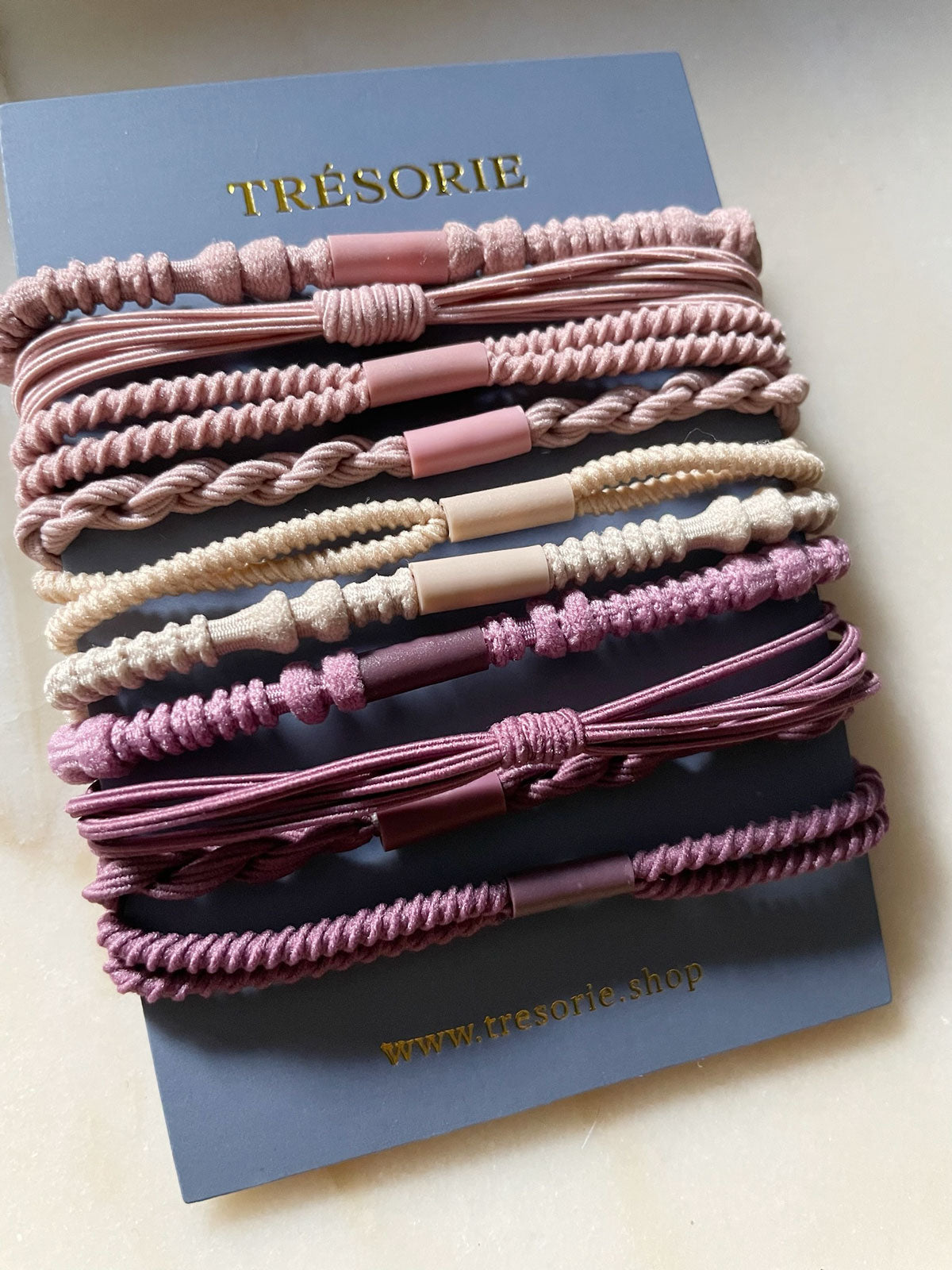 A versatile set of 10 elastic hair ties with a relaxed, surf-inspired style. The Wave Set features a mix of braided, twisted, and smooth textures, finished with simple matte details. They hold your hair securely without snagging and are soft enough to wear all day.