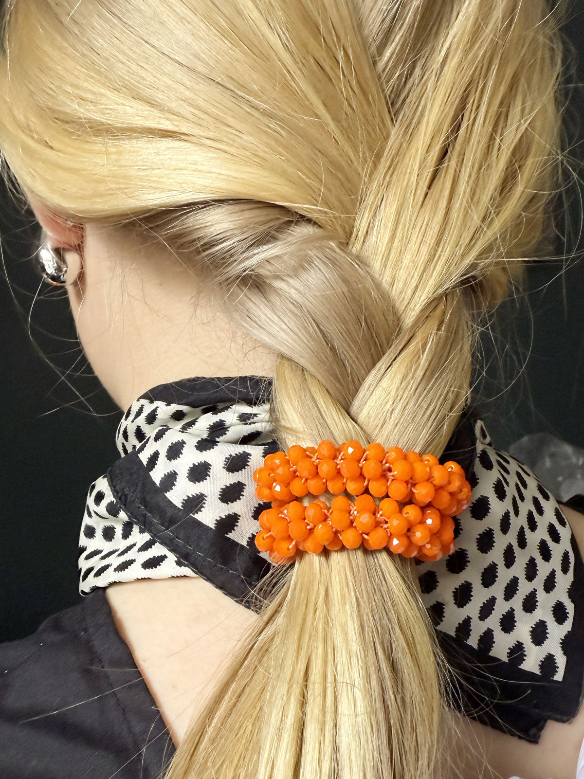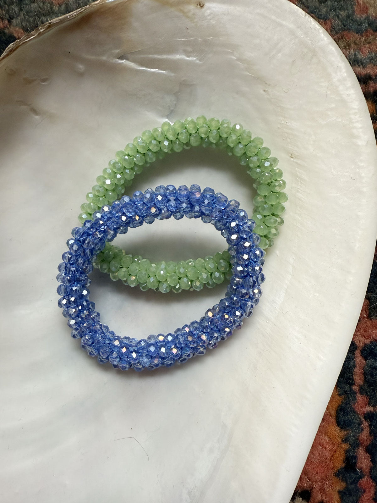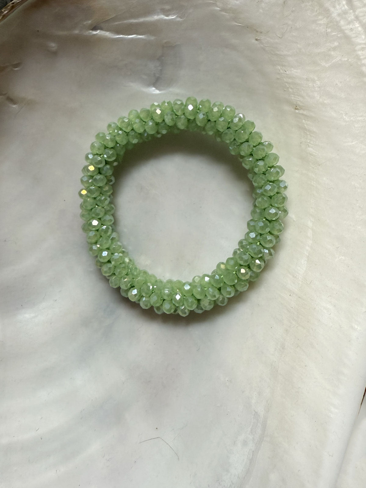 Made with shimmering faceted beads and a strong elastic core, it holds your hair securely without snagging — and doubles as a chic accessory when not in use.
