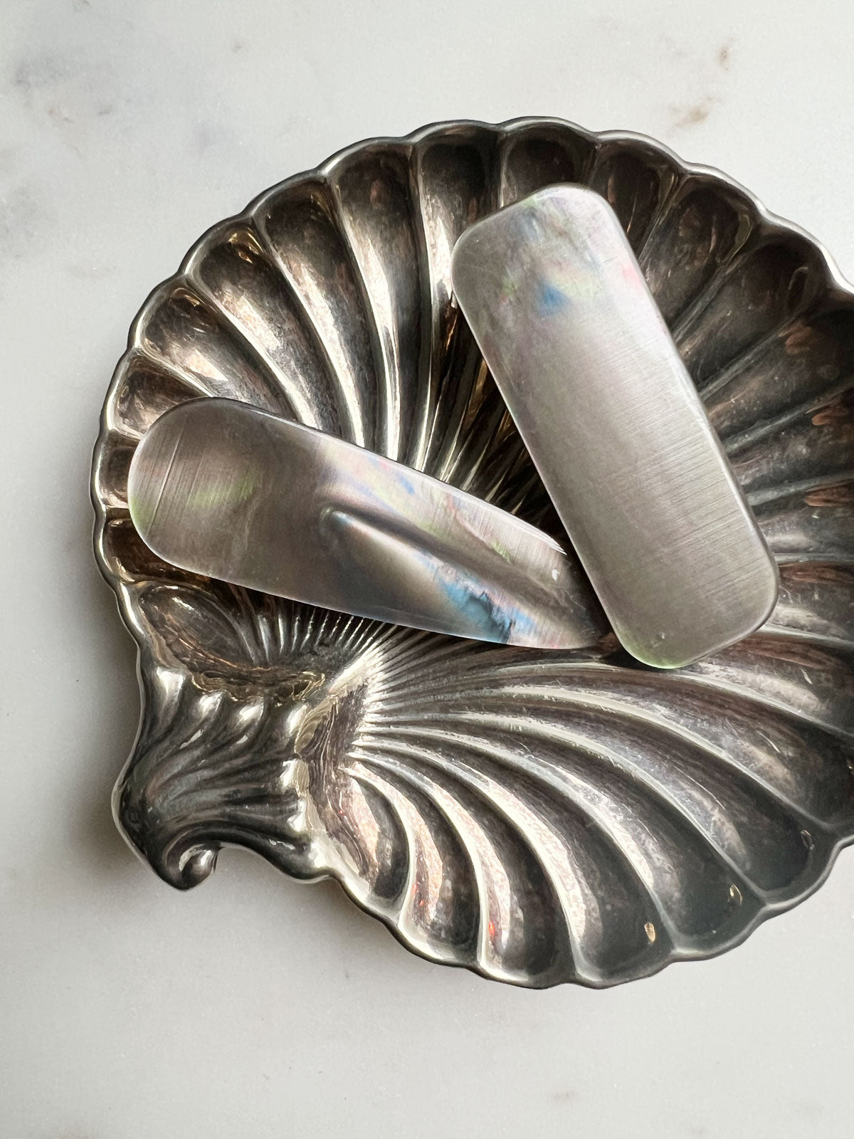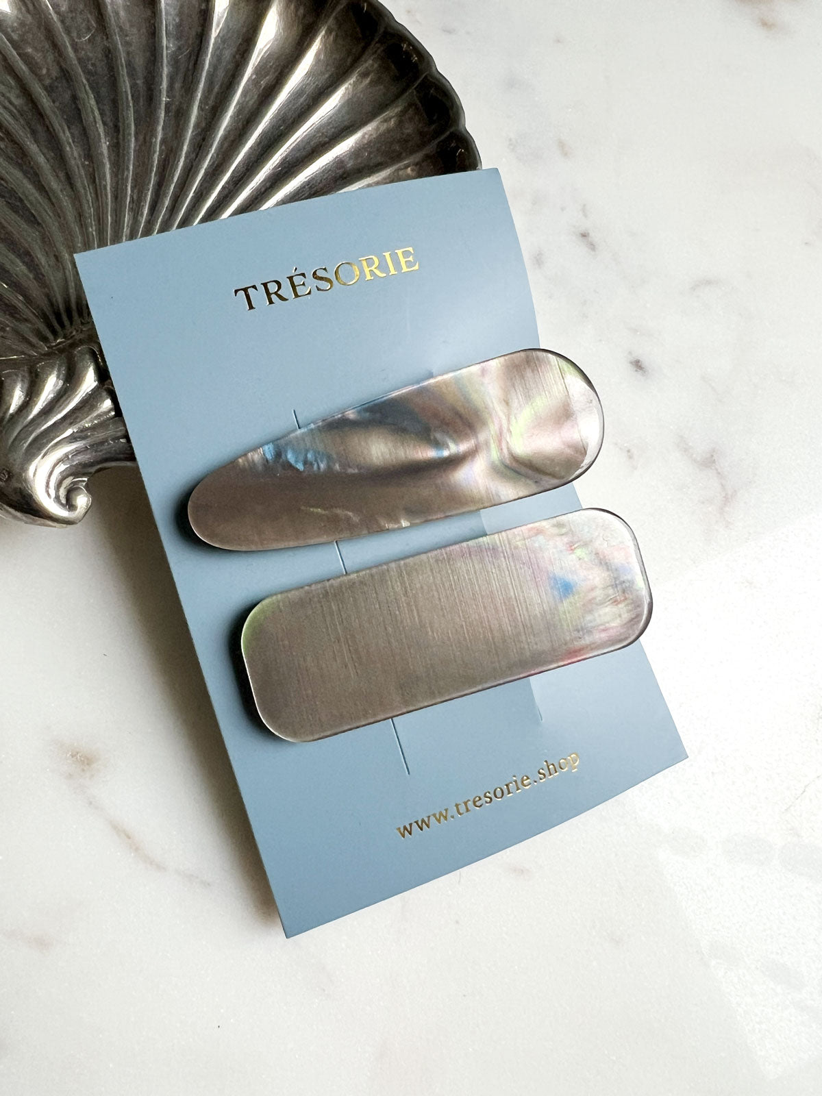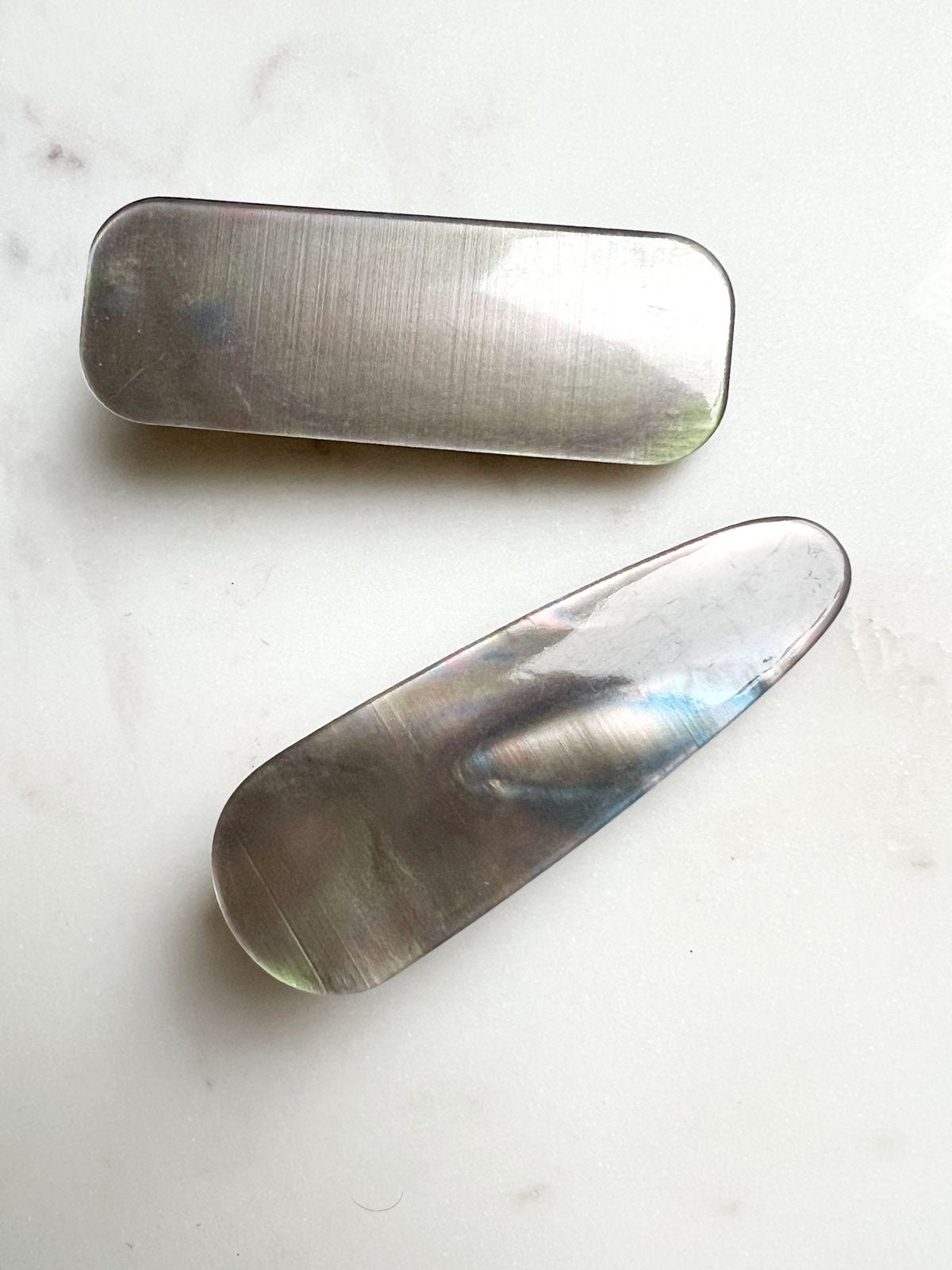 This set of two hair clips features beautiful shimmering acetate plates paired with sturdy alligator clasps for a secure hold. Perfect for adding a touch of elegance to your everyday hairstyles or finishing off a polished look.