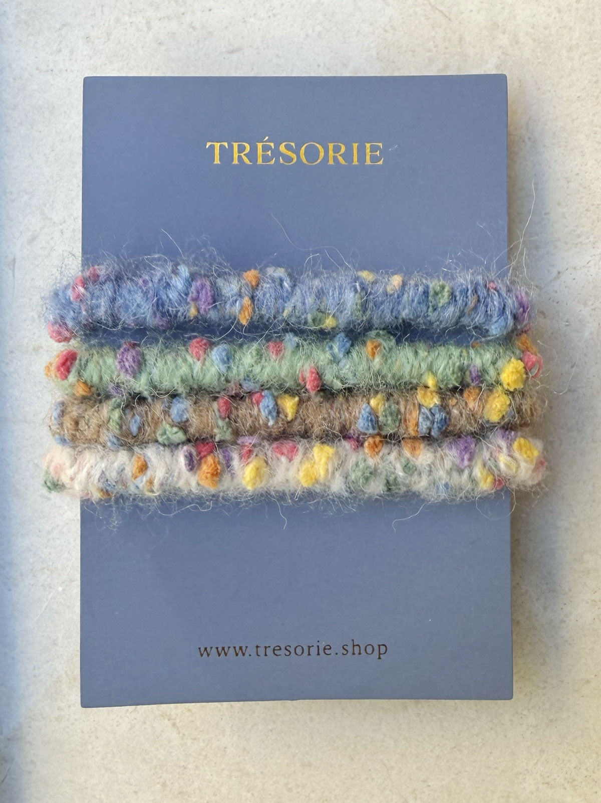 Soft and playful bouclé hair ties that add a touch of color and texture to your everyday look. The set includes four different ties made from colorful bouclé yarn, each featuring a decorative bead in the center. They hold hair securely while being gentle on it, and can also be worn around the wrist as a small accessory.