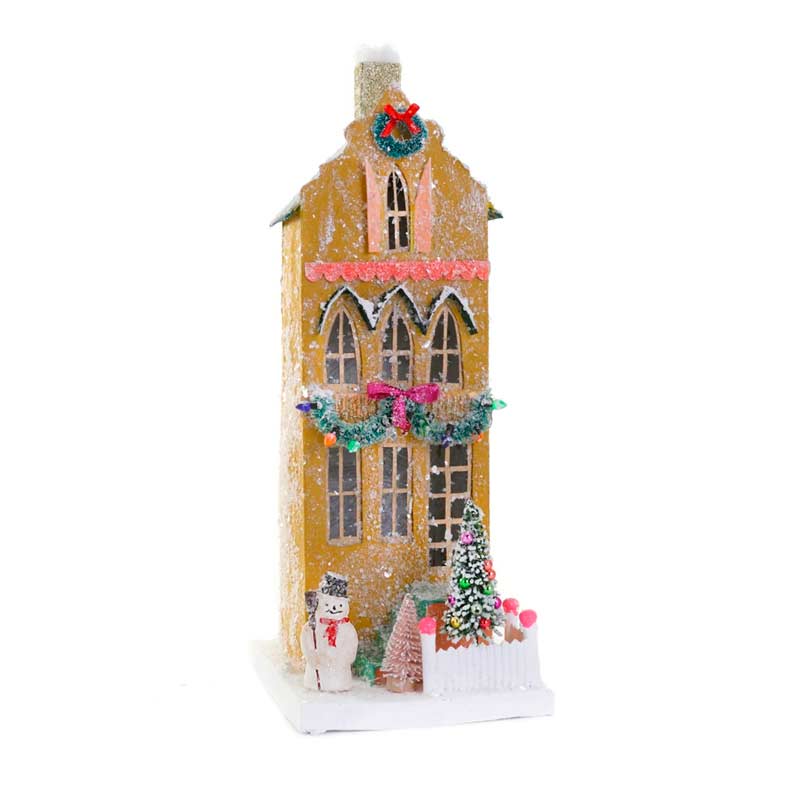 Made from sturdy cardboard, each house is filled with delightful details and sparkling glitter, creating a whimsical atmosphere. Designed with a small hole in the back for easy placement of a LED light, these houses can be illuminated to showcase the enchanting glow through their windows.
