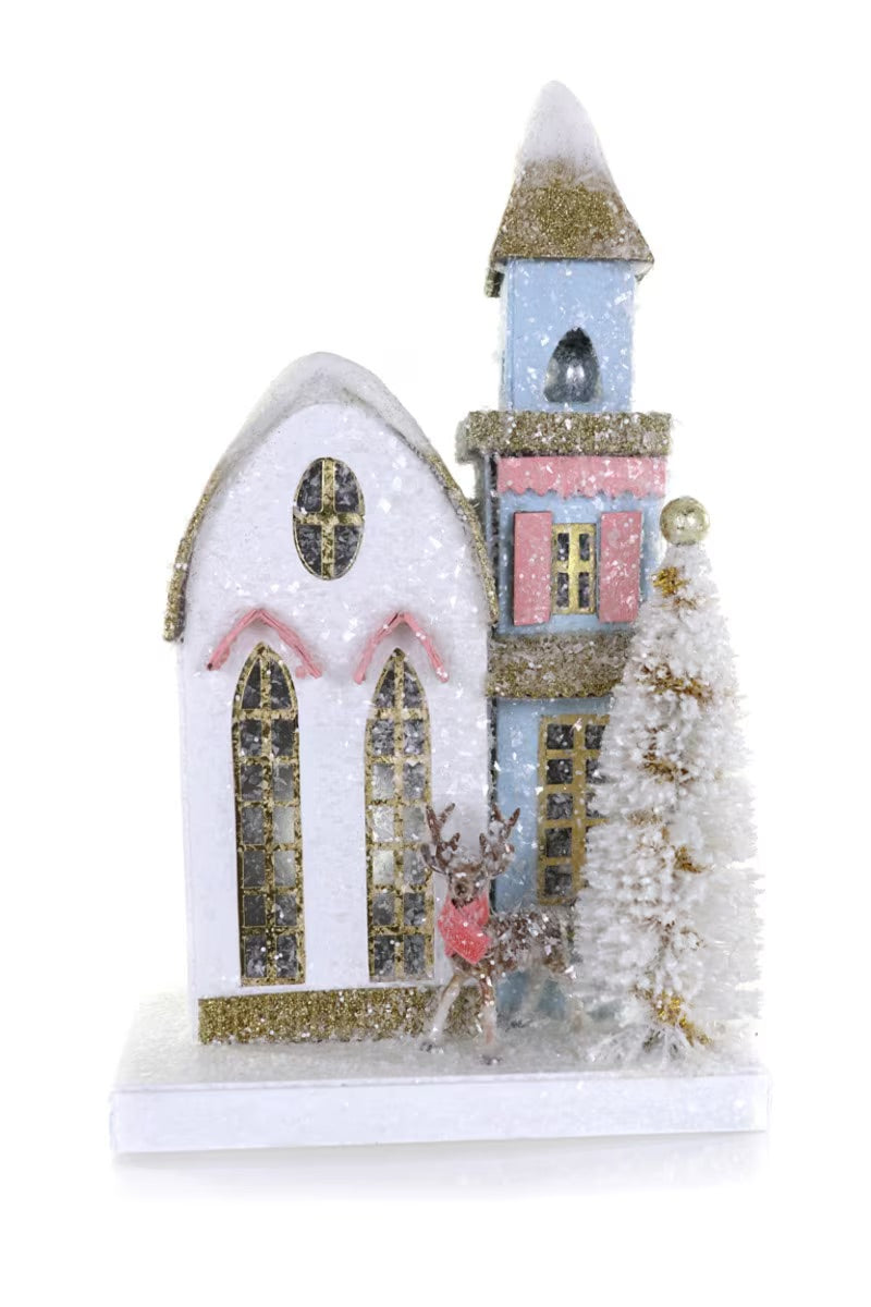 Made from sturdy cardboard, each house is filled with delightful details and sparkling glitter, creating a whimsical atmosphere. Designed with a small hole in the back for easy placement of a LED light, these houses can be illuminated to showcase the enchanting glow through their windows.