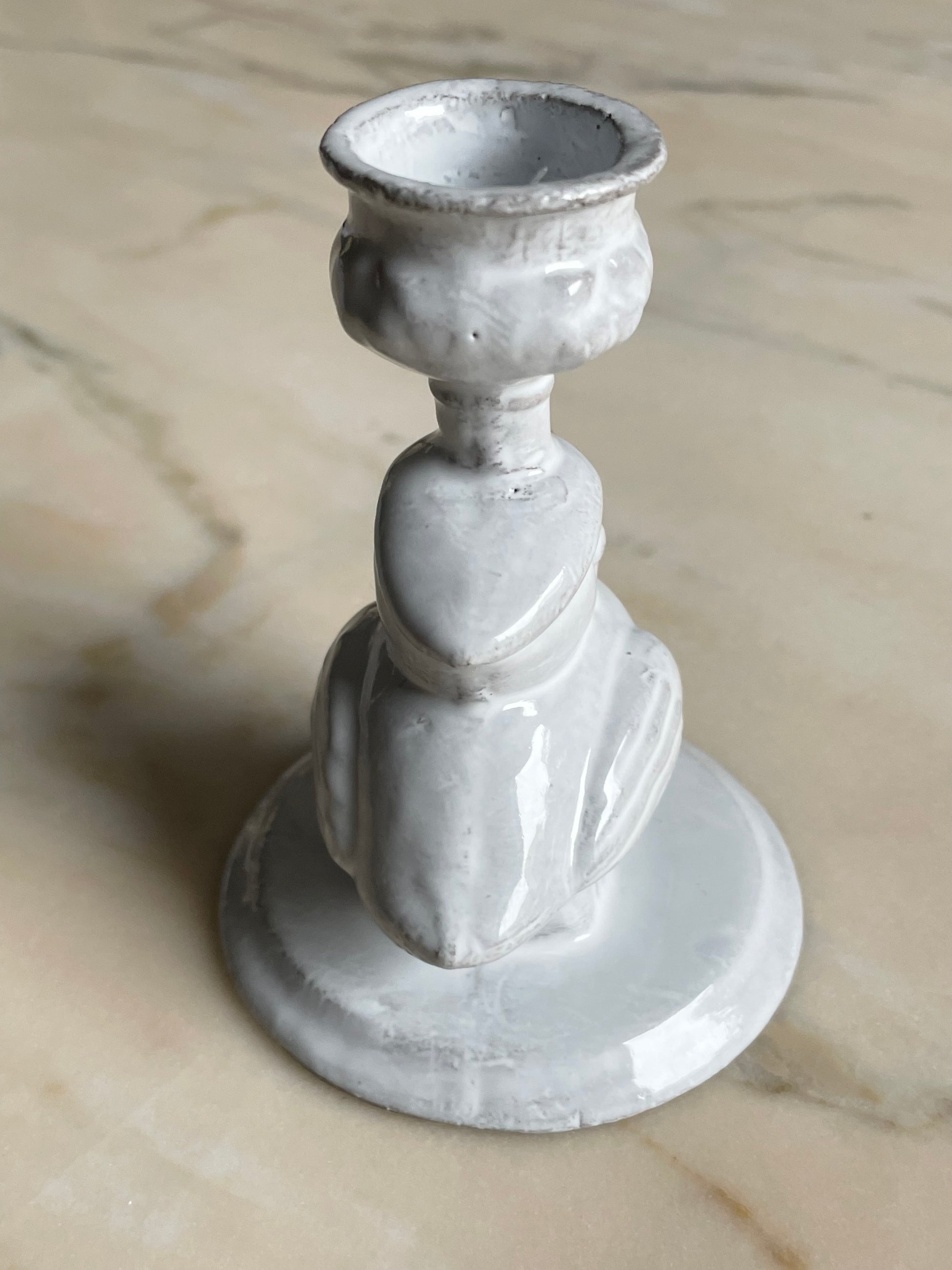 Adorable candlestick. Astier de Villatte was founded in 1996 by Ivan Pericoli and Benoît Astier de Villatte. Each of their ceramics is handmade in Paris from black terra cotta clay with their signature glossy white glaze. Inspired by 18th and 19th-century designs, each piece is unique.