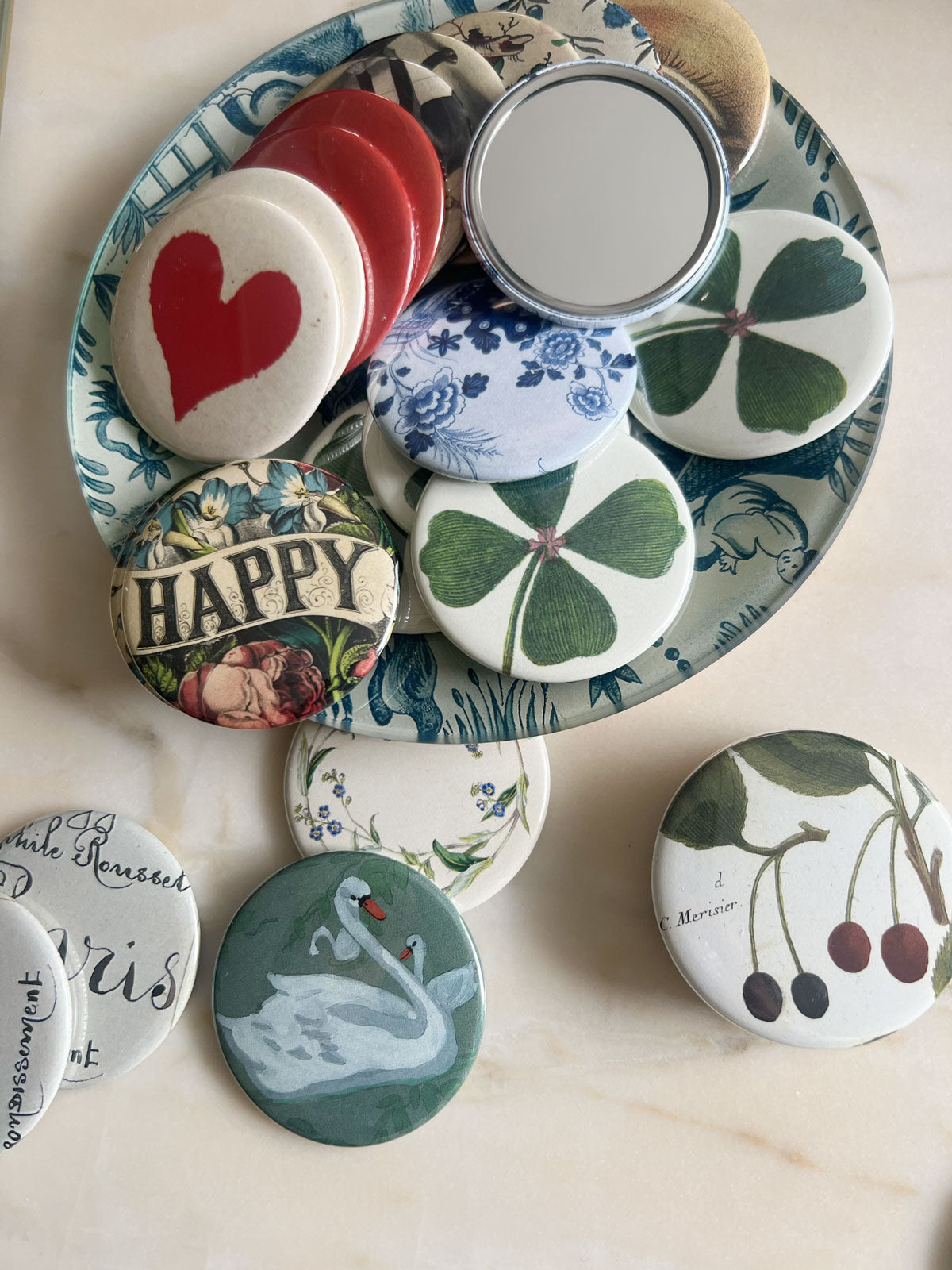 Handmade in John Derian's New York studio, this charming pocket mirror features a beautiful backing image from his archival collection. Its compact size fits perfectly in your pocket or purse, making it a practical accessory or a thoughtful gift. Ideal for mailing, it slips easily into an envelope!