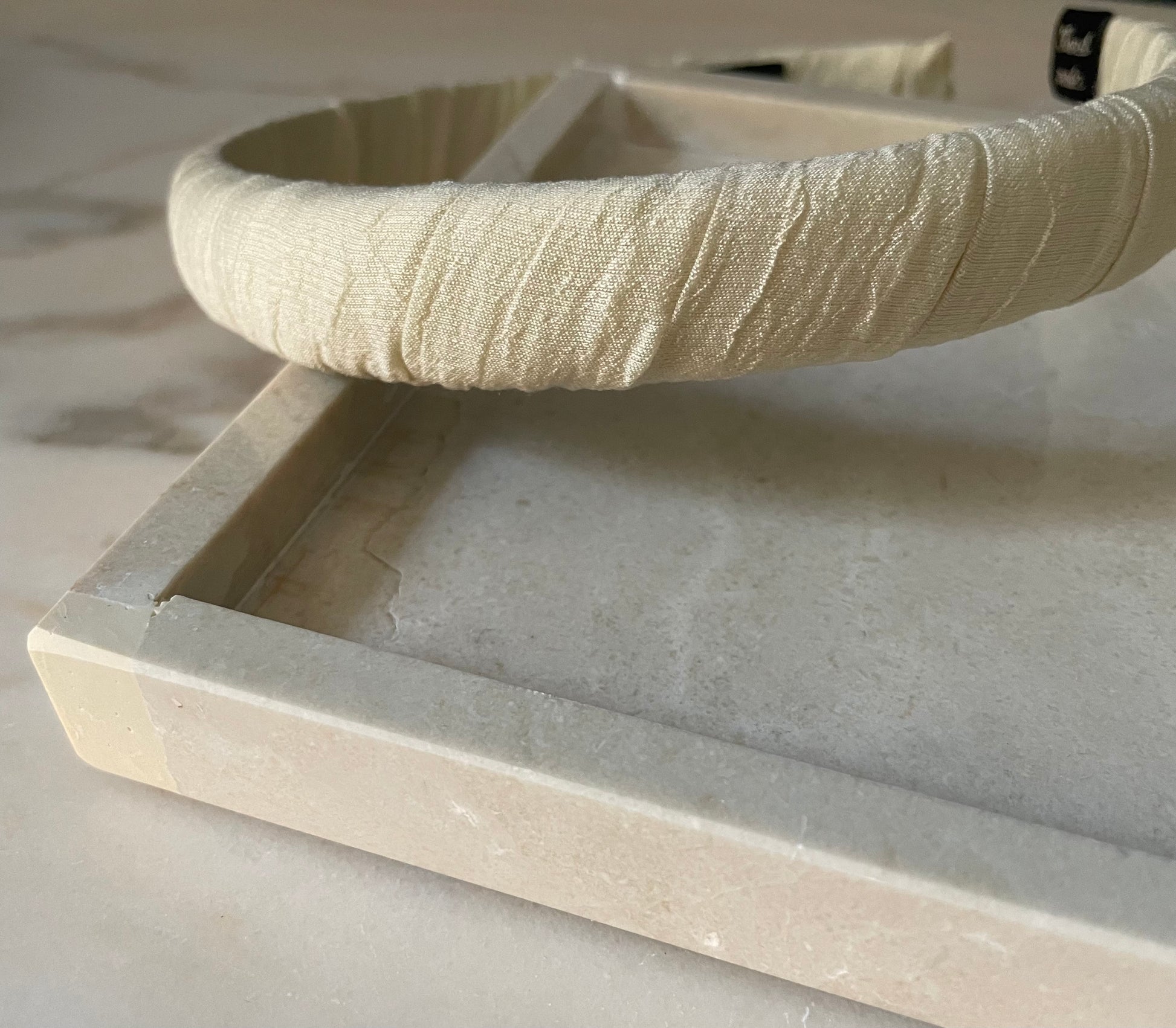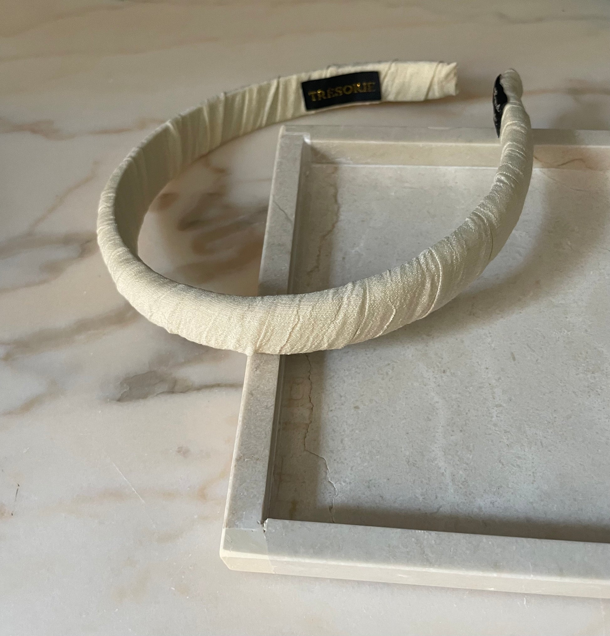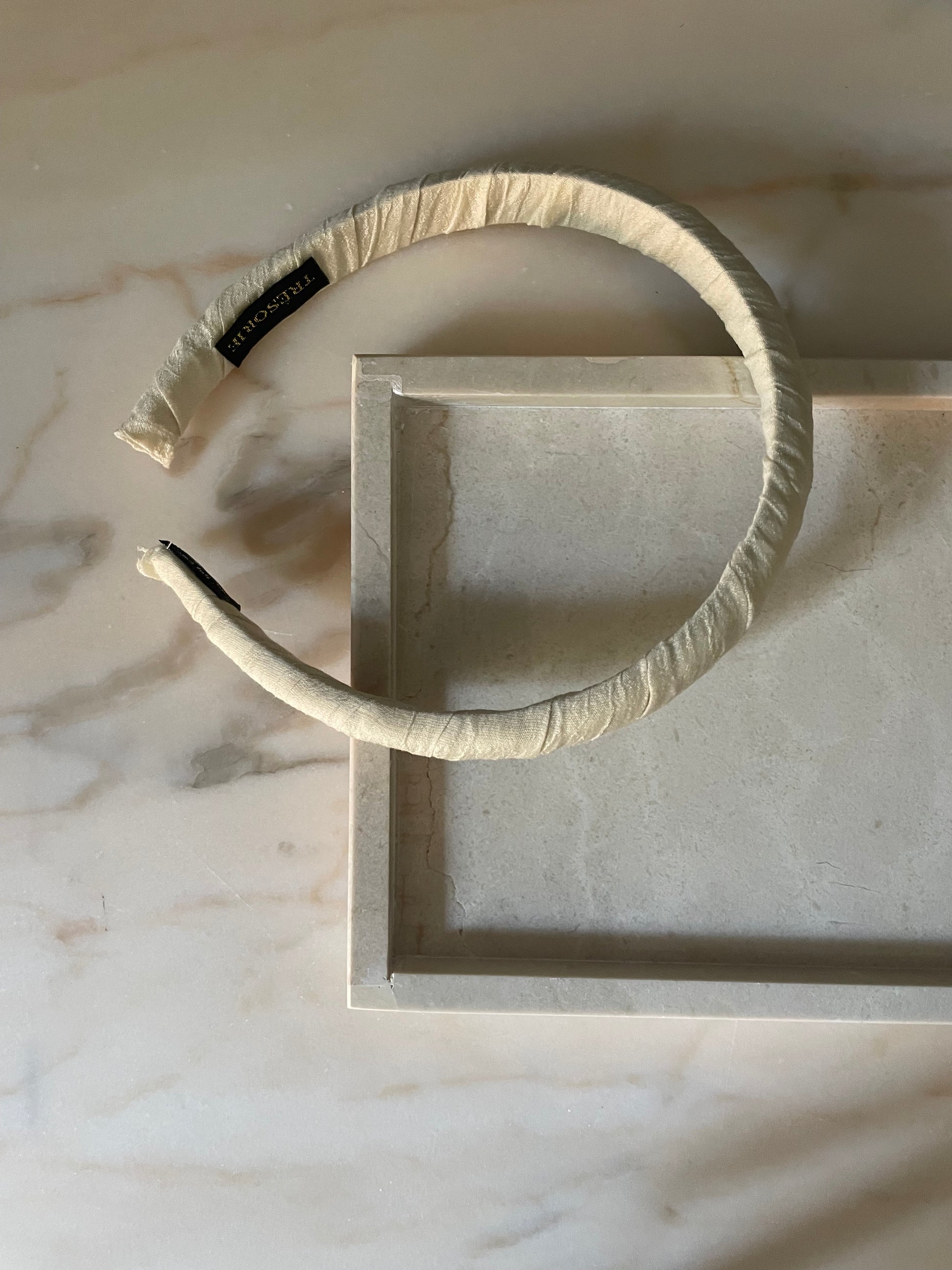A softly padded headband wrapped in light-toned fabric with a subtle, textured finish. The Alva Headband offers effortless elegance for everyday wear — perfect for adding a soft, polished touch to any outfit.