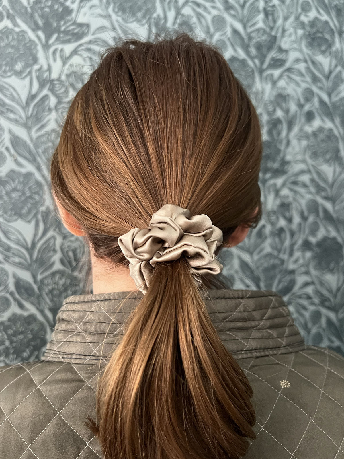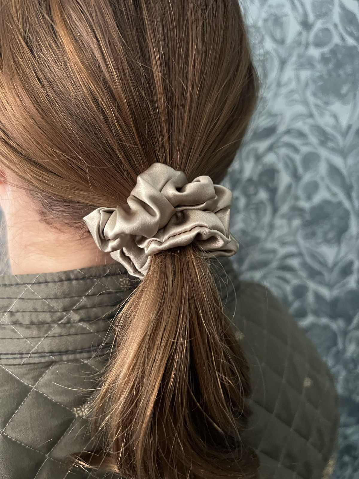 Pure silk hair scrunchie designed for gentle, crease-free styling. Made from 100% silk, this luxurious scrunchie reduces hair breakage, prevents tangles, and protects against frizz.