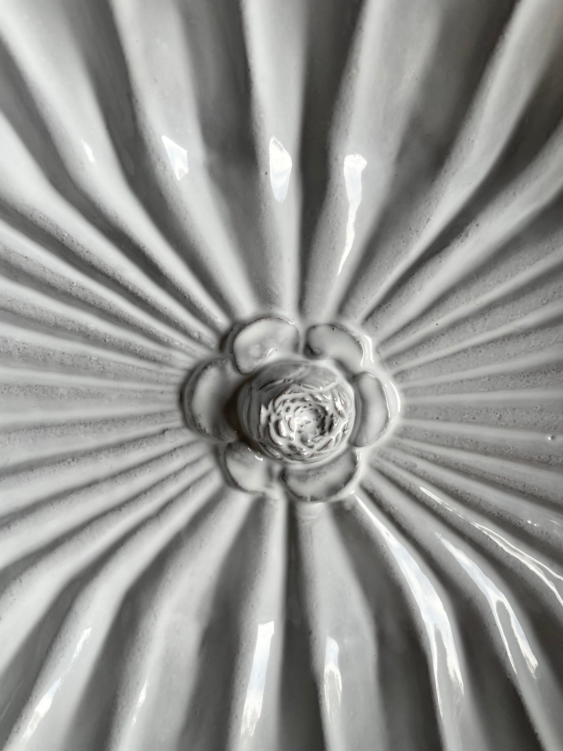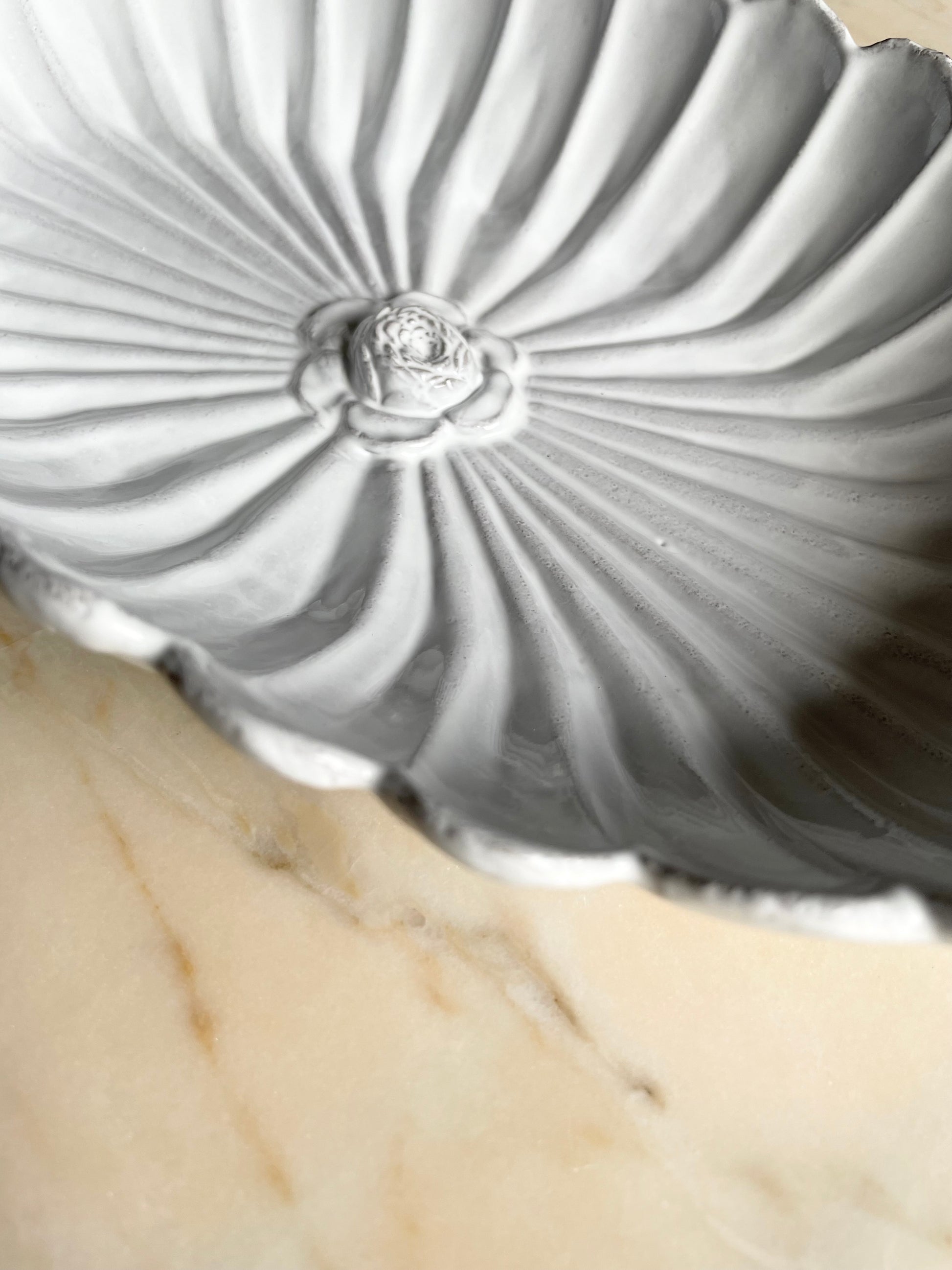 Charming decorative platter. Astier de Villatte was founded in 1996 by Ivan Pericoli and Benoît Astier de Villatte. Each of their ceramics is handmade in Paris from black terra cotta clay with their signature glossy white glaze. Inspired by 18th and 19th-century designs, each piece is unique.