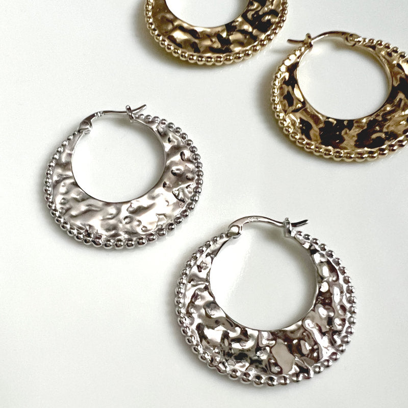 A stunning blend of modern elegance and ethnic charm. Crafted from high-quality materials, these hoops feature a broad, flat design with a beautifully textured hammered surface that captures and reflects light.