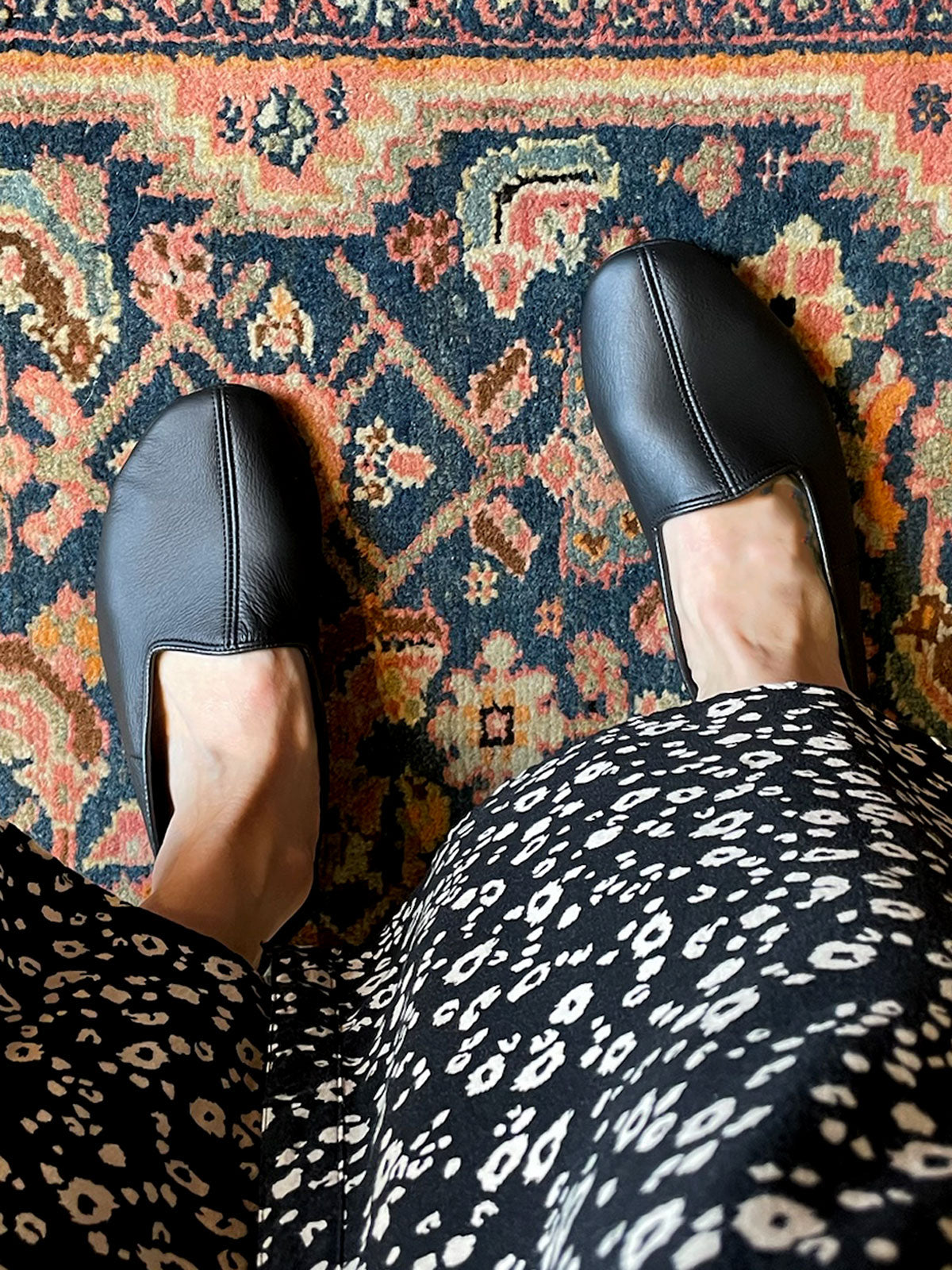 Elegant leather house slippers made from exceptionally smooth leather and lined with soft cotton flannel. Light and comfortable—feels almost like wearing socks.