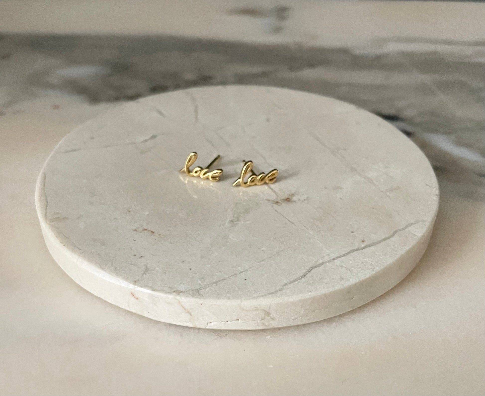 Stud earrings shaped into the word love, crafted from polished gold-plated 925 sterling silver. The Luv Studs are playful, bold, and full of heart — a golden everyday statement with a touch of sweetness.