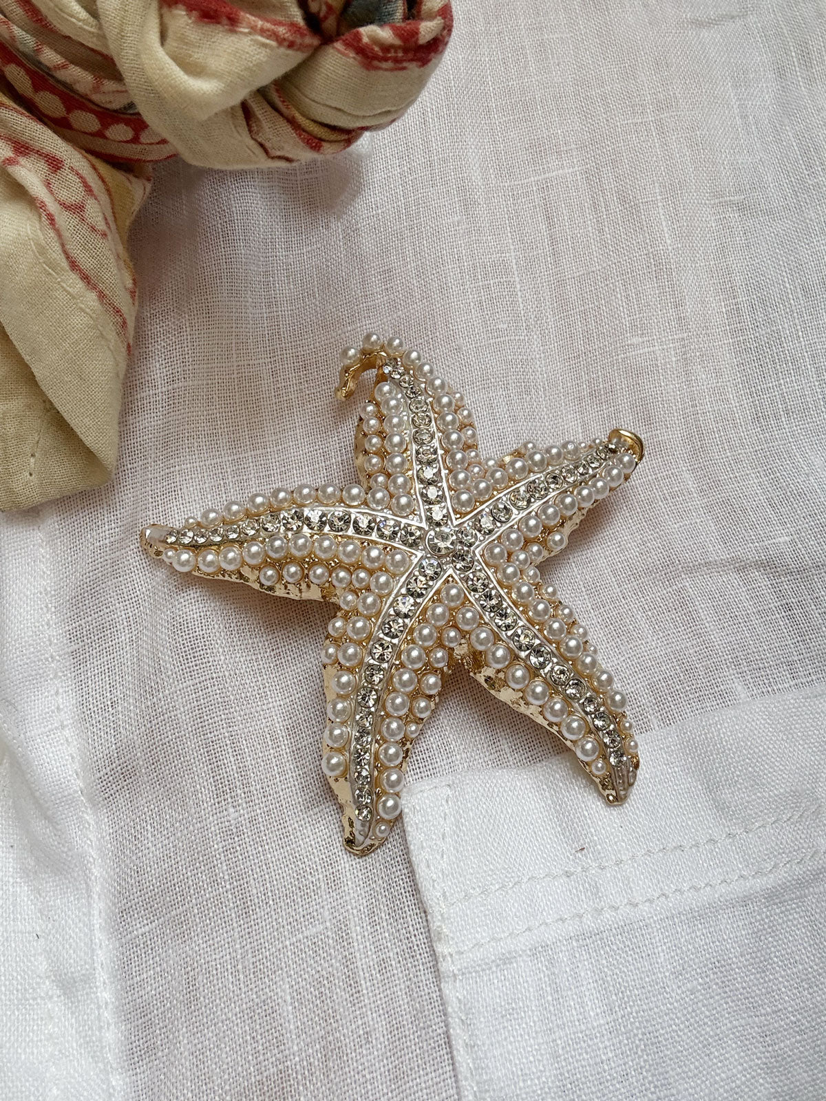 A large, striking sea star brooch made of metal with a gold-tone finish. The textured surface is fully paved with small pearls and clear crystals. A distinctive piece that catches the light beautifully.