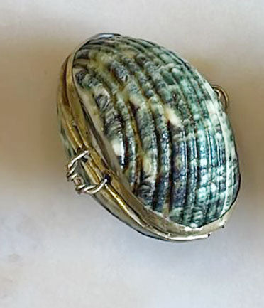 A small trinket box made from a real green shell with deep natural ridges and a matte finish. Fitted with a brass hinge, perfect for storing rings or small keepsakes.