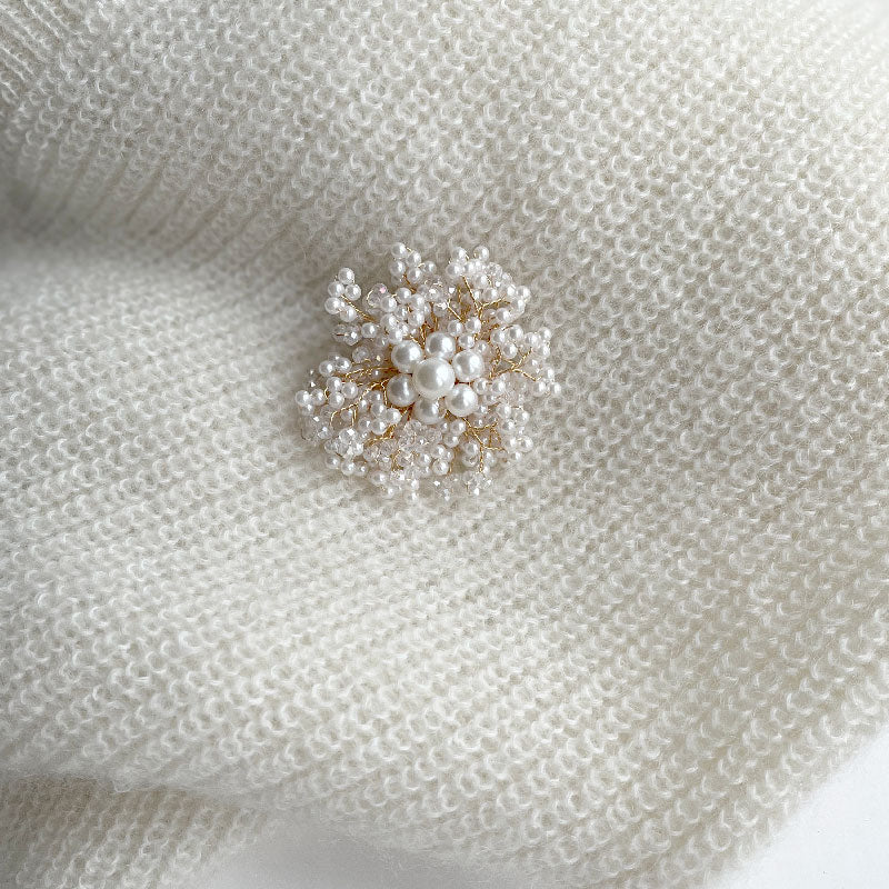 A delicate brooch featuring a light, floral-inspired design with shimmering faux pearls and crystal beads. The airy, handcrafted construction creates a soft yet striking look — perfect for adding an elegant touch to coats, scarves, or eveningwear.