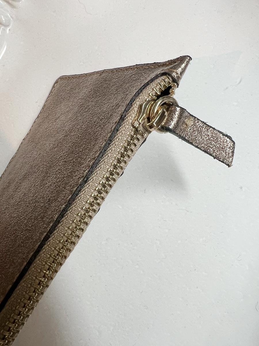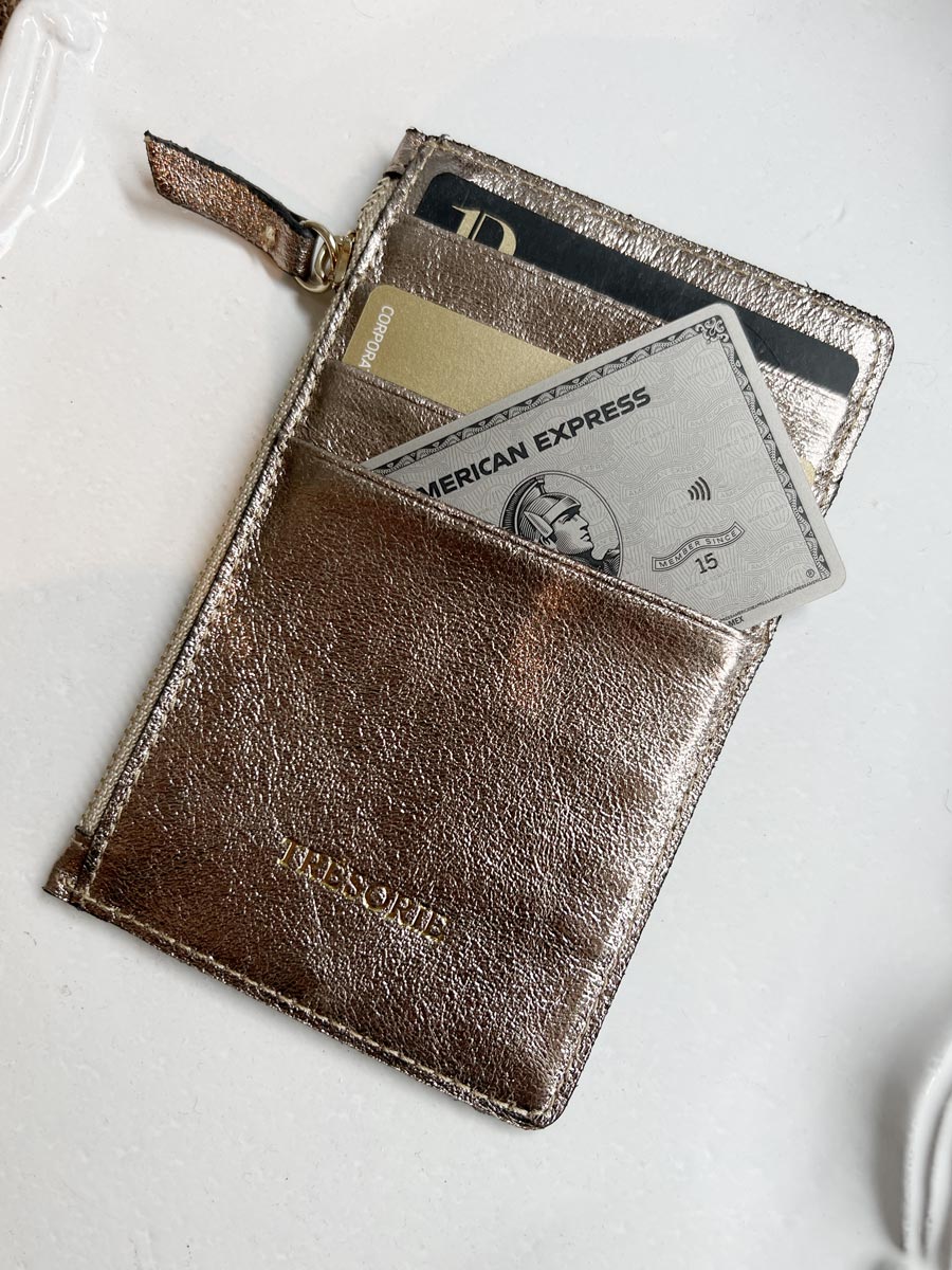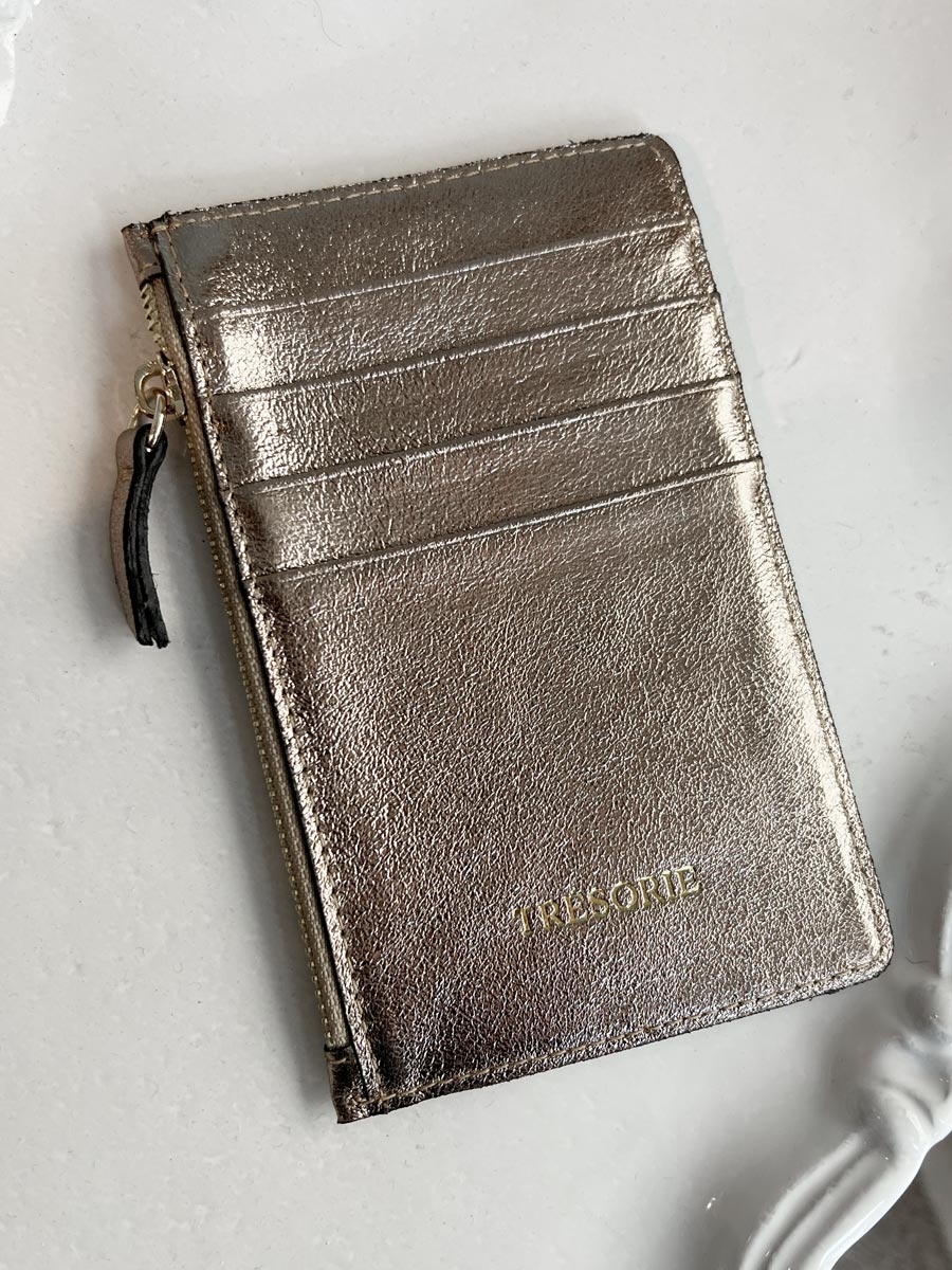 Leather card holder with a zipper pocket.